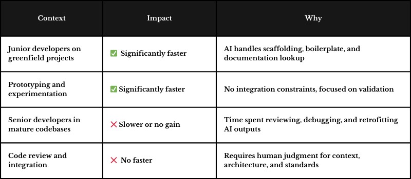 1. Don’t assume AI universally accelerates development. Context matters enormously. Junior developers on new projects will see massive gains. Senior developers integrating AI code into mature systems may actually slow down.